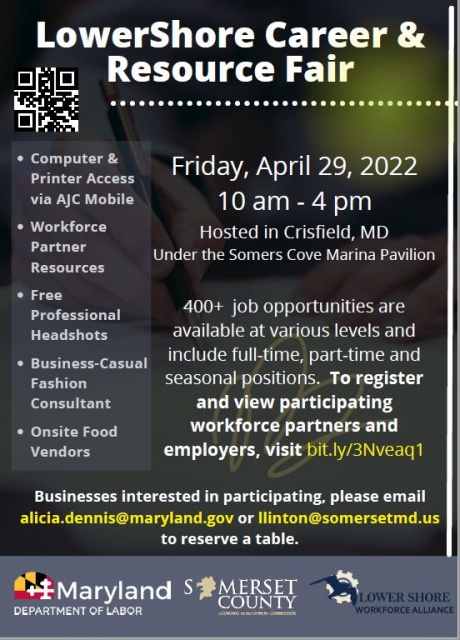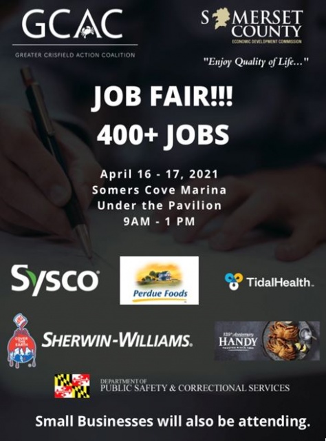 Somerset County Economic Development will be co-hosting another Job Fair on Friday, April 29that the Somerset Cove Marina pavilion in Crisfield from 10:00 a.m. – 4 p.m.